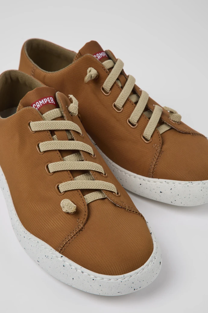 Brown textile men’s sneakers with OrthoLite® Recycled™ removable footbeds and EVA outsoles (20% recycled).