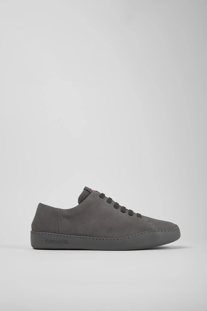 Gray nubuck men’s sneakers with OrthoLite® Recycled™ footbeds and EVA outsoles (20% recycled).
