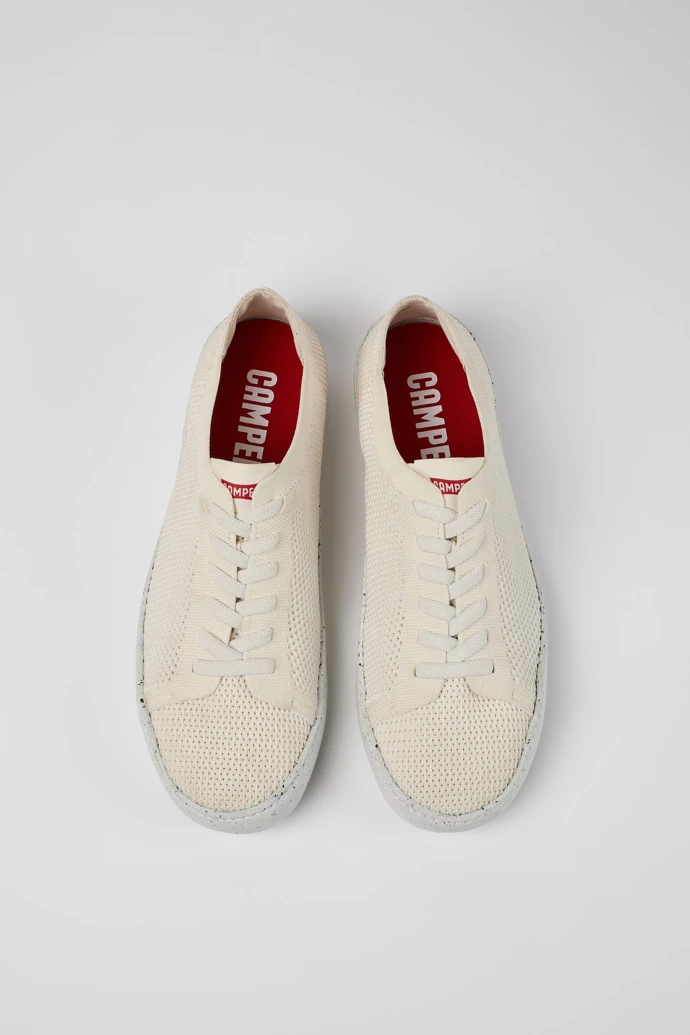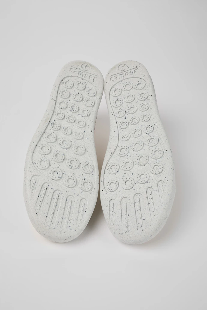 White recycled PET men’s sneakers with 100% EVA outsoles (20% recycled) and elastic laces.
