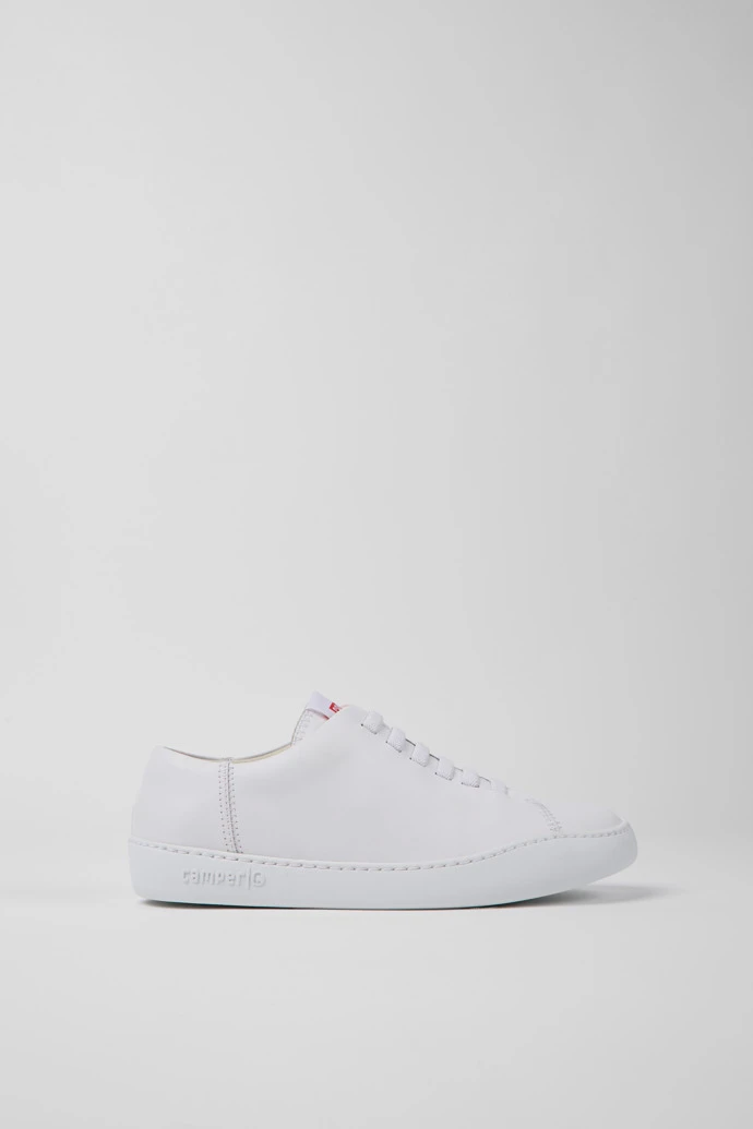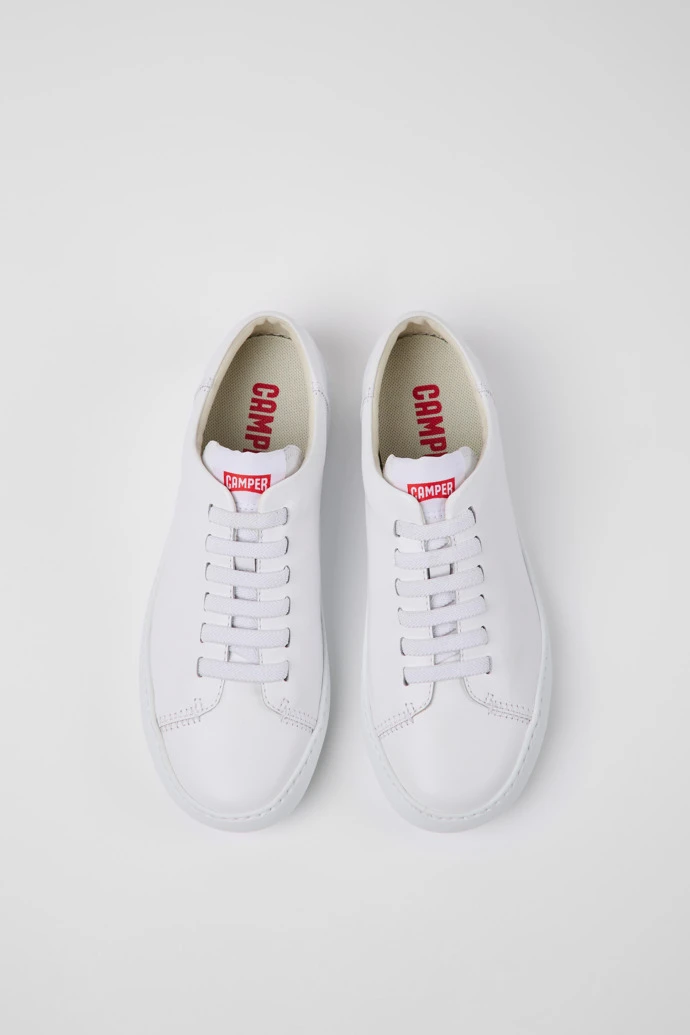Women’s white sneaker. Full grain leather upper with white EVA outsole and elastic laces.