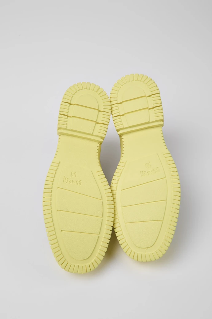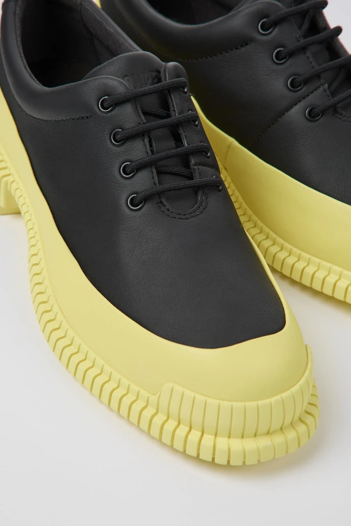 Black and yellow leather lace-up women’s shoes with OrthoLite® Recycled™ footbeds and EVA outsoles.