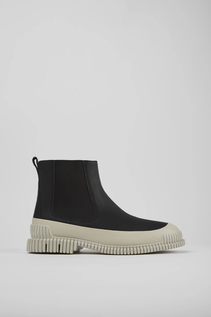 Black leather men’s chelsea boots with OrthoLite® Recycled™ removable footbeds and EVA outsoles.