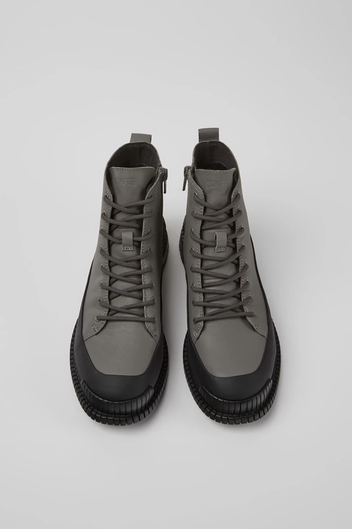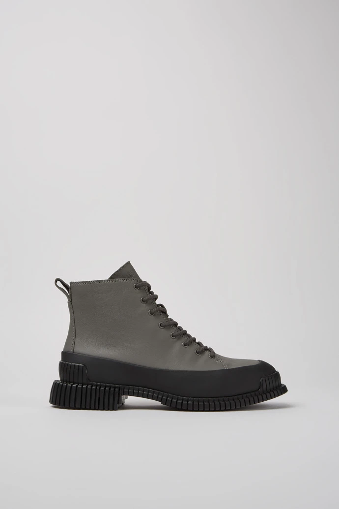 Gray and black leather lace-up women’s boots with OrthoLite® Recycledâ„¢ footbeds and EVA outsoles.