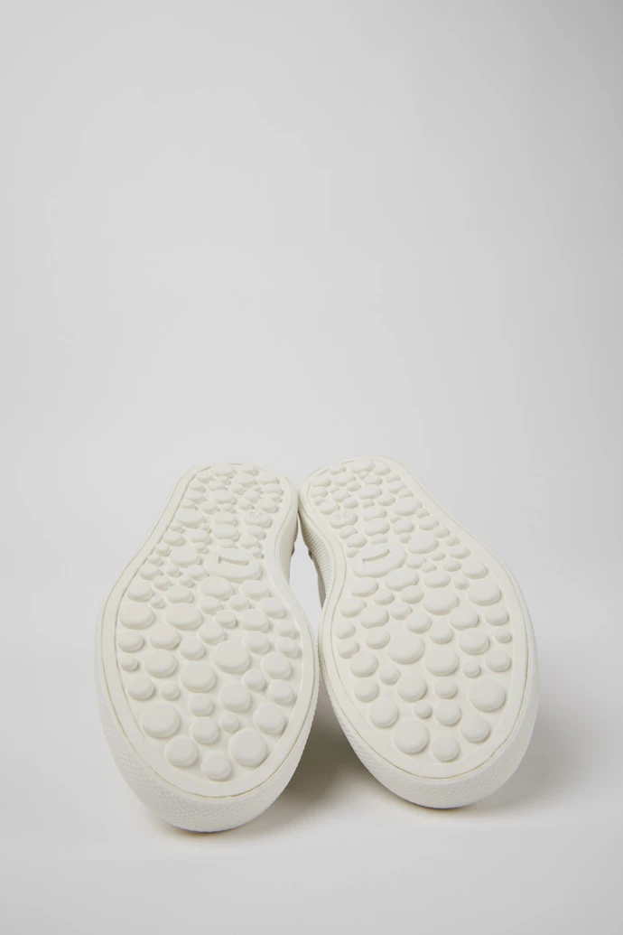 White leather kids’ shoes with OrthoLite® Recycled™ removable footbeds and rubber outsoles.