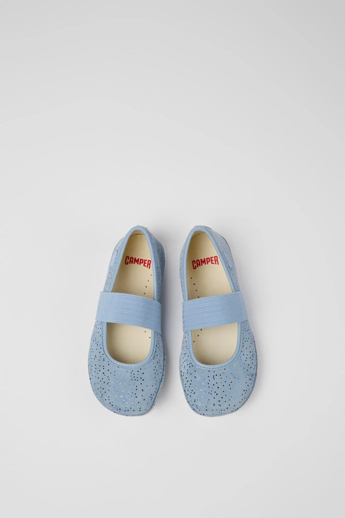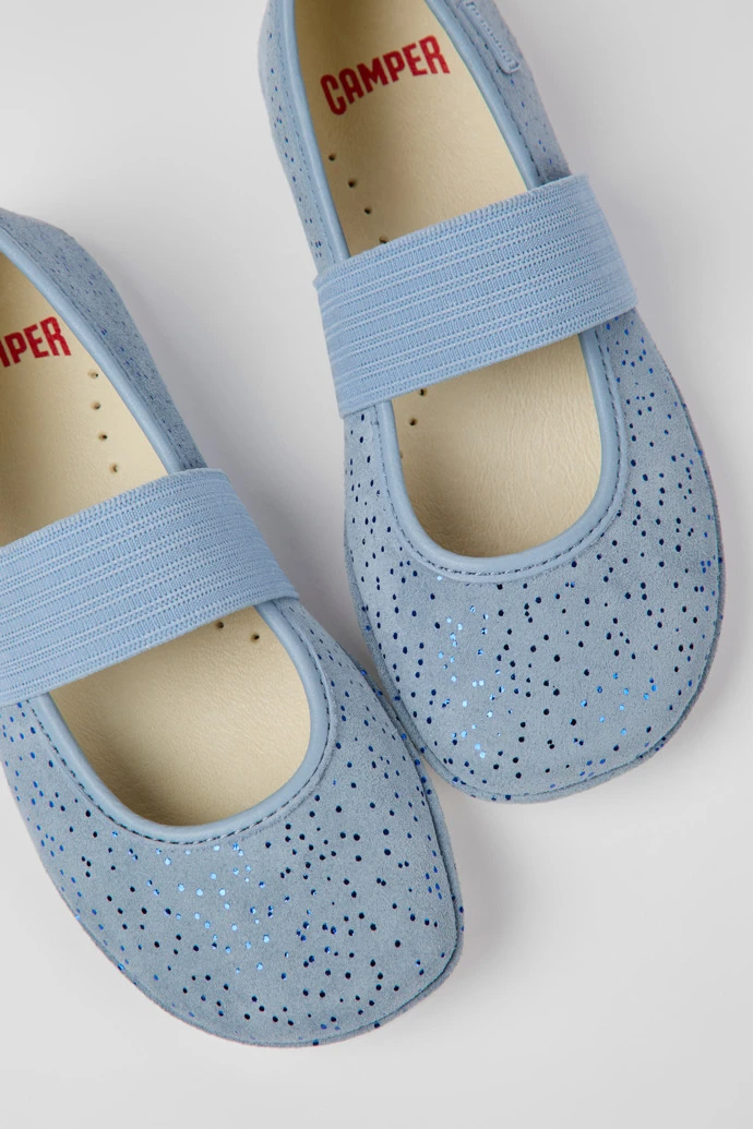 Blue nubuck kids’ ballerinas with elastic band, removable EVA footbeds, and rubber outsoles (20% recycled).