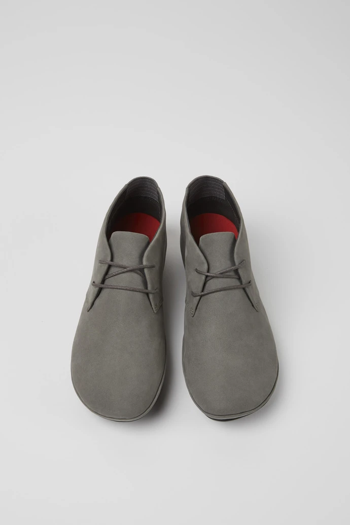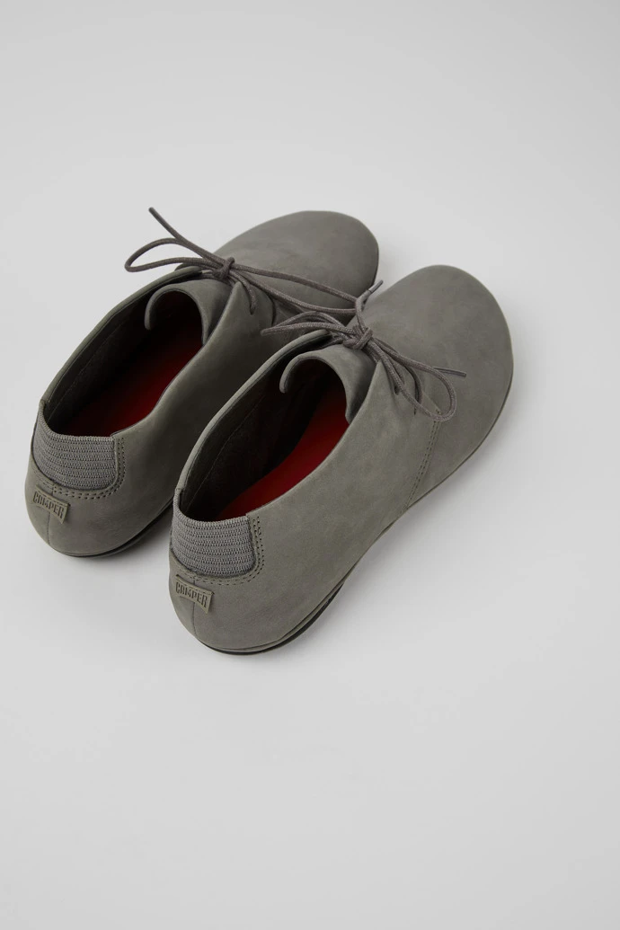 Gray nubuck lace-up women’s shoes with rubber outsoles (20% recycled).
