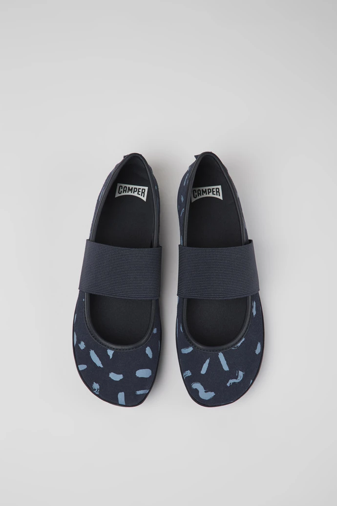 Multicolored nubuck and leather women’s ballerina flats with an elastic strap, removable EVA footbeds, and rubber outsoles (20% recycled).