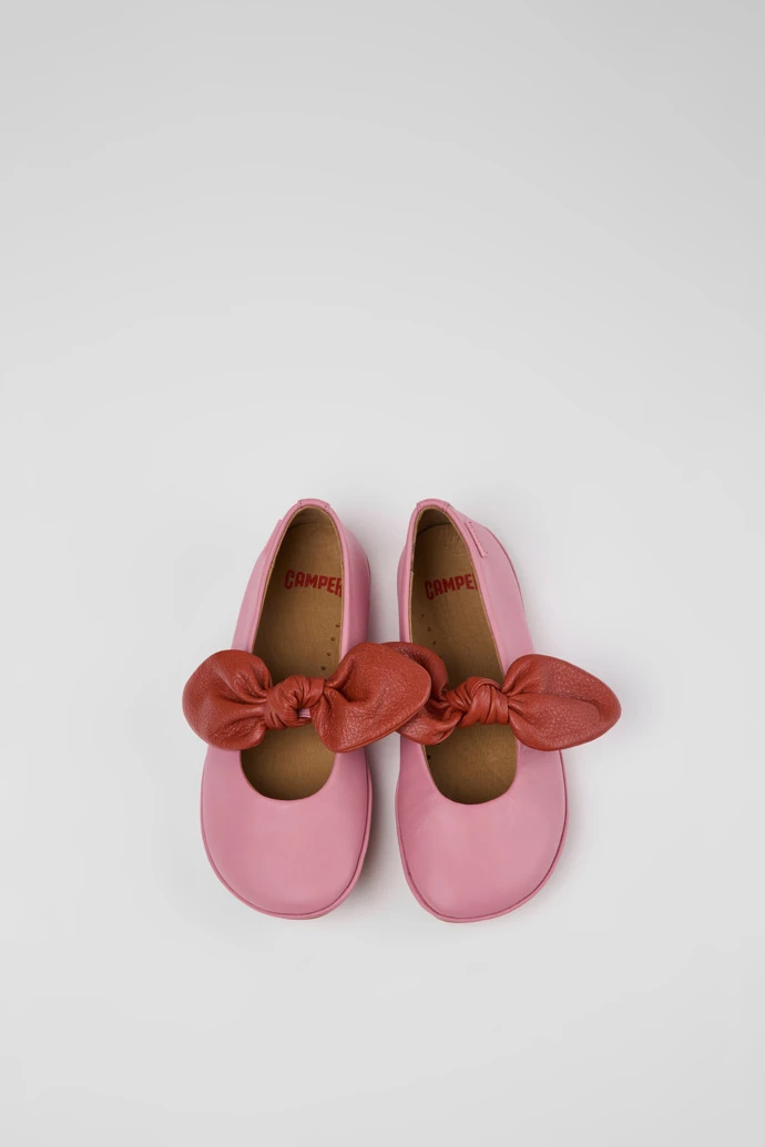 Pink and red leather kid’s ballerinas with elastic bow band, removable EVA footbed and rubber outsole (20% recycled)
