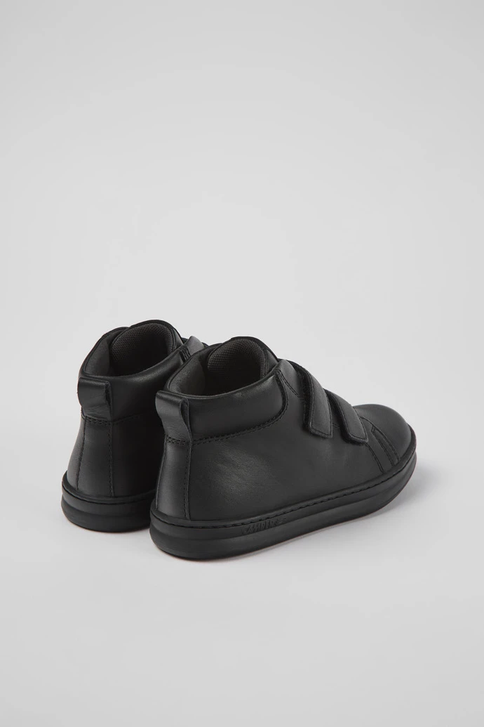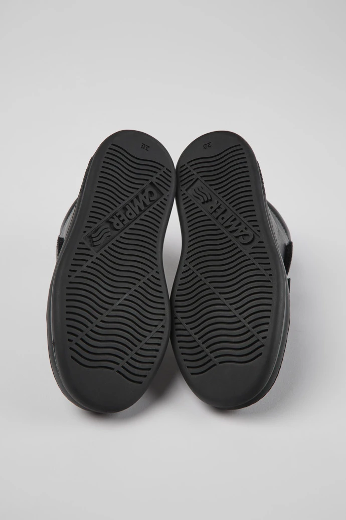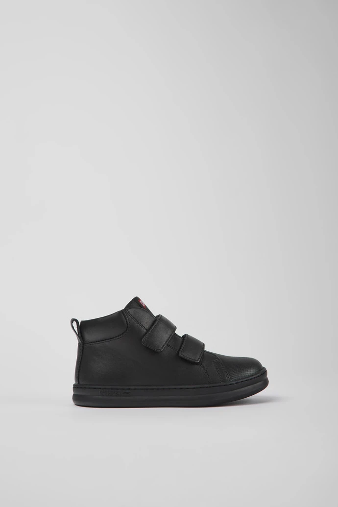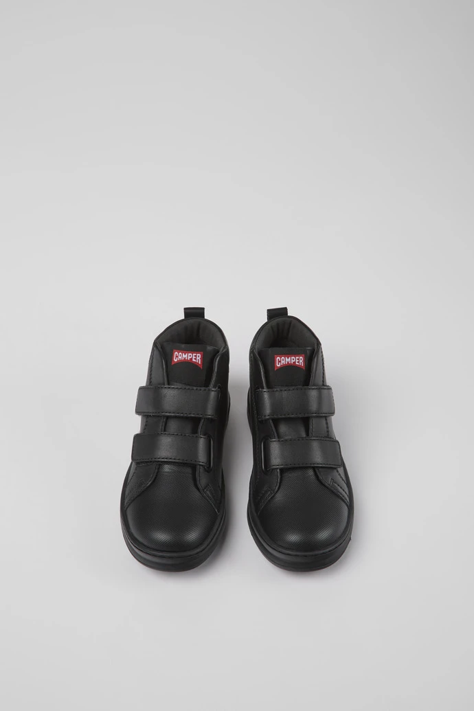 Black leather and textile kids’ ankle boots with OrthoLite® Recycled™ removable footbeds and rubber outsoles.