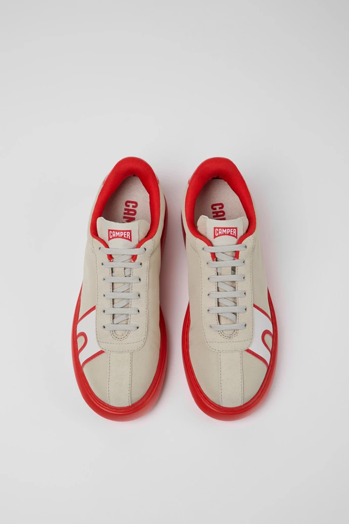 Gray and red textile and nubuck women’s sneakers with OrthoLite® Recycled™ removable footbeds and XL EXTRALIGHT® Organix™ 3.0 outsoles (30% bio-circular compounds).