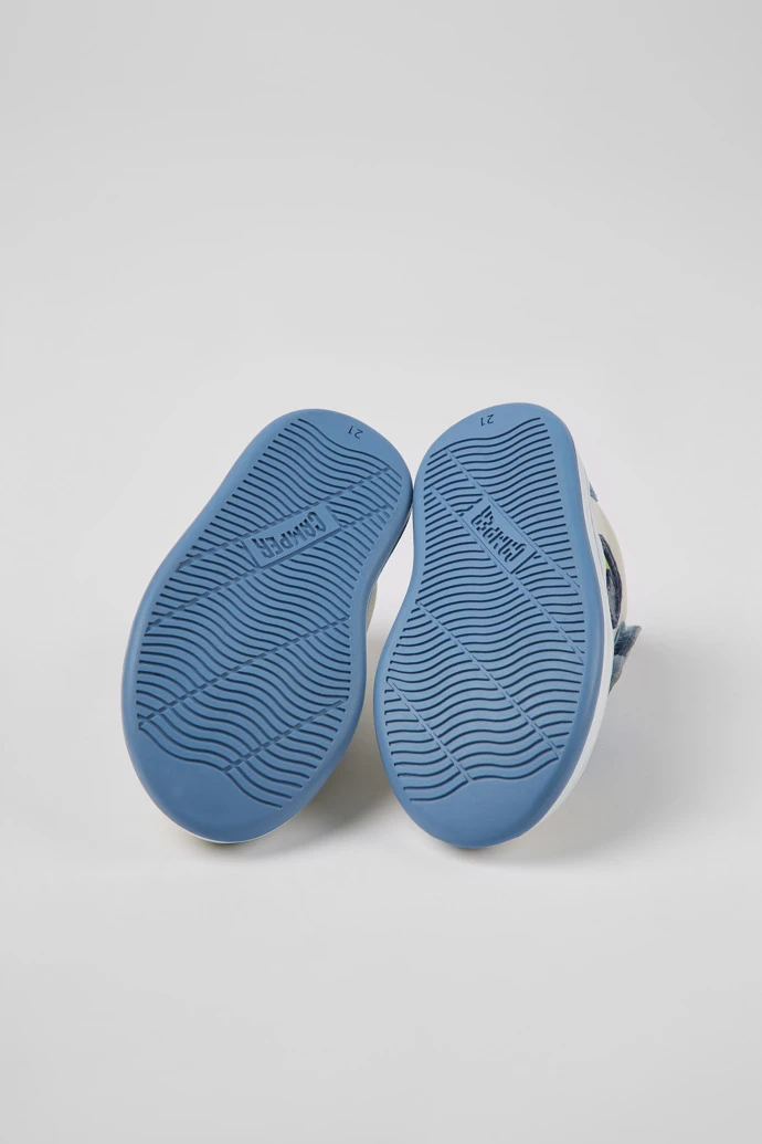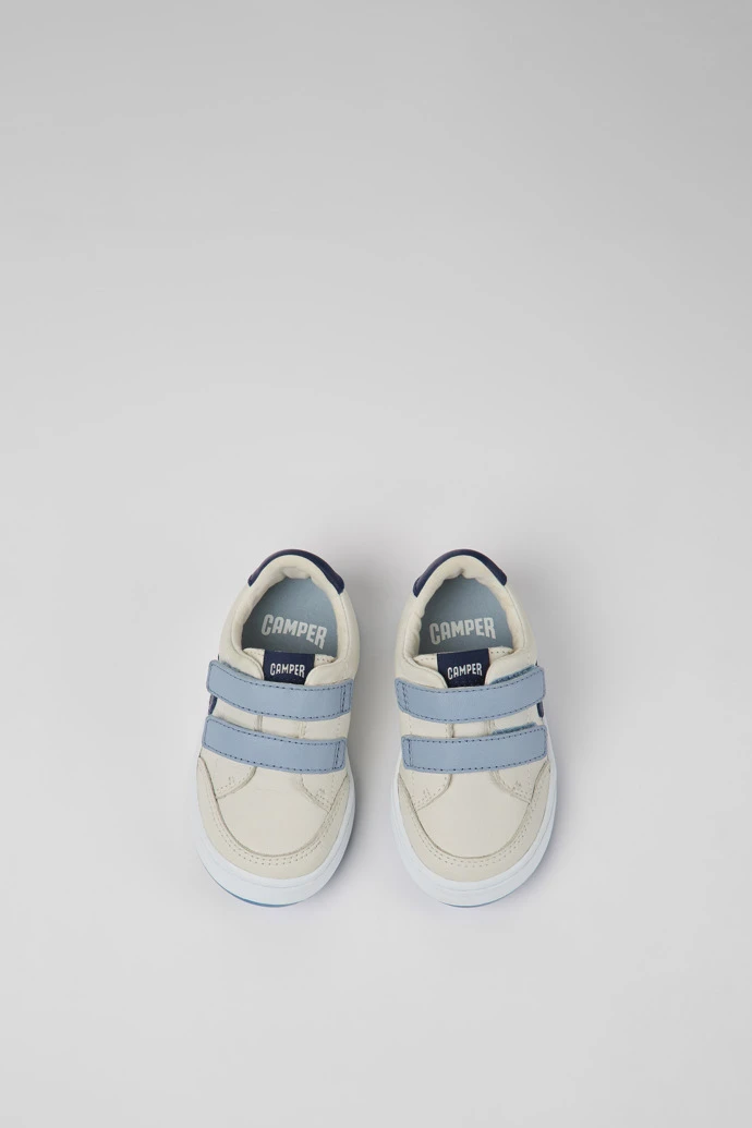 Multicolored leather kids’ sneakers with a hook-and-loop closing system, OrthoLite® Recycled™ removable footbeds, and rubber outsoles.