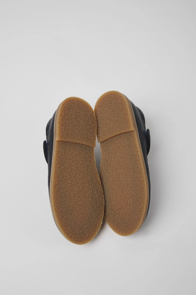 Navy blue leather kids’ shoes with OrthoLite® Recycled™ removable footbeds and rubber outsoles.