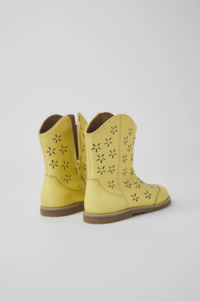 Yellow leather kids’ boots with OrthoLite® Recycledâ„¢ removable footbeds and rubber outsoles.