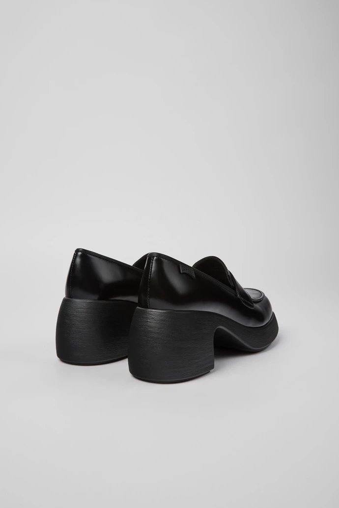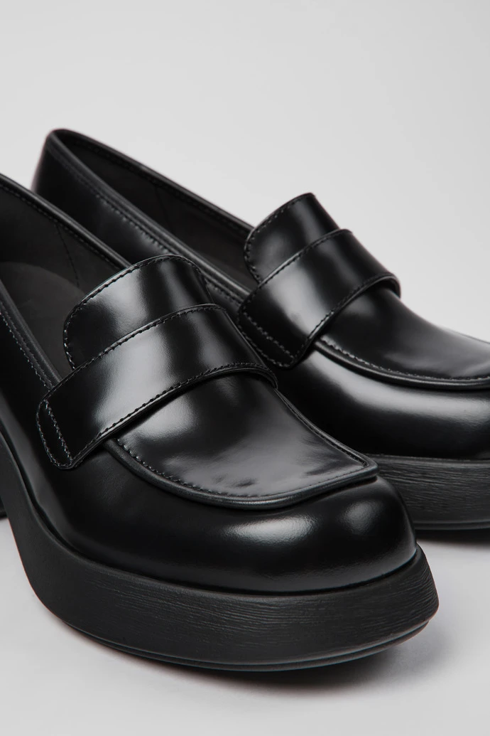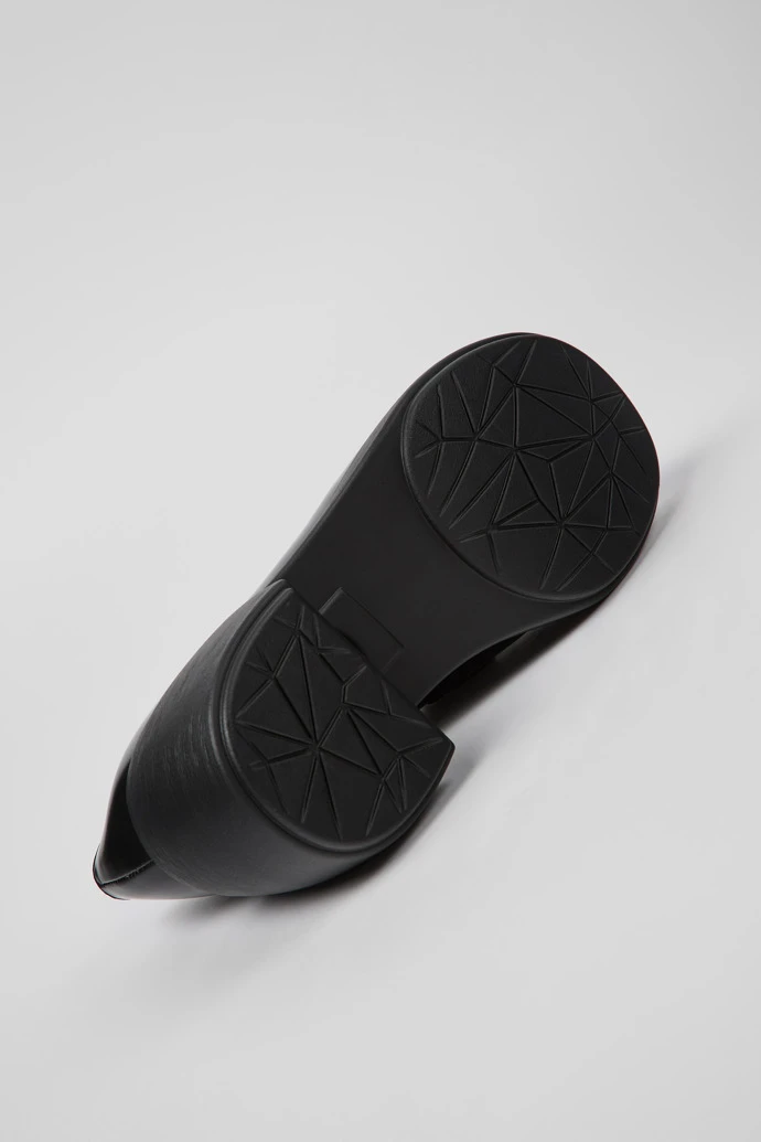 Black leather women’s shoes with removable EVA footbeds and PU outsoles.