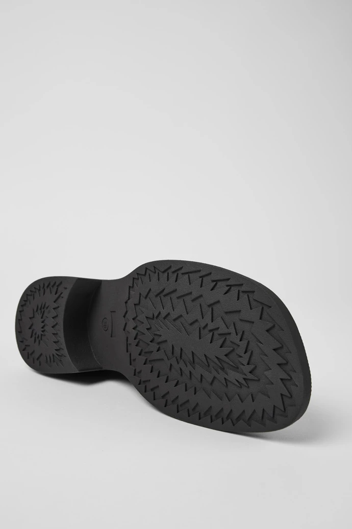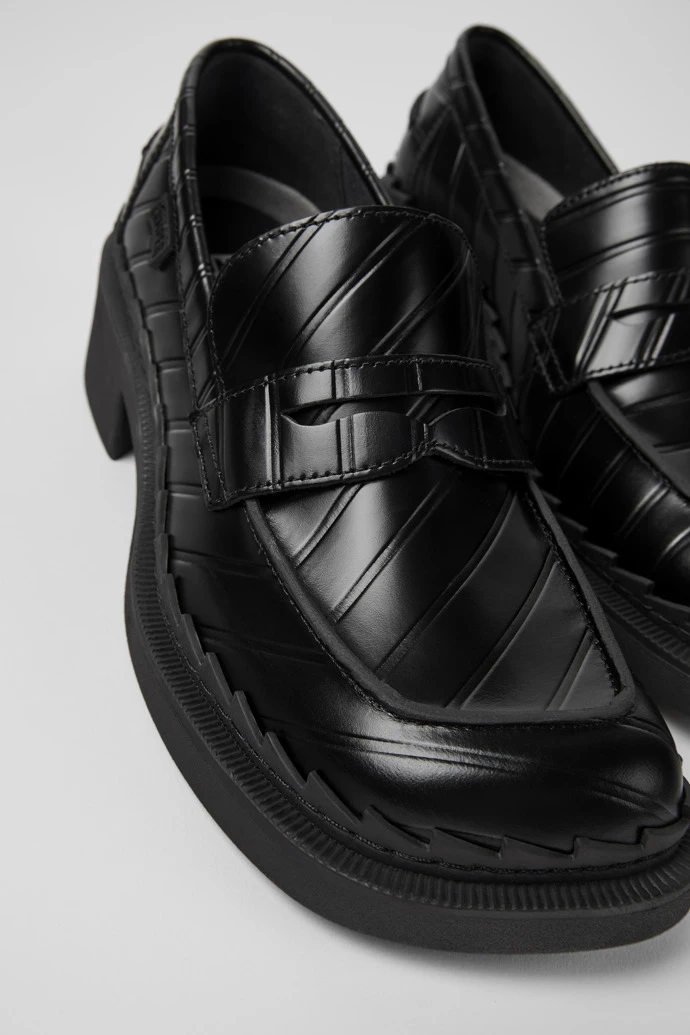 Black leather women’s loafers with OrthoLite® Recycledâ„¢ removable footbeds and TR outsoles.