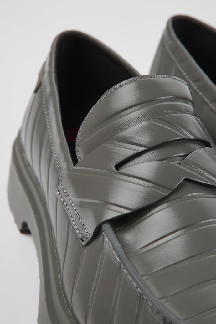 Gray leather men’s loafers with OrthoLite® Recycledâ„¢ removable footbeds and rubber outsoles.