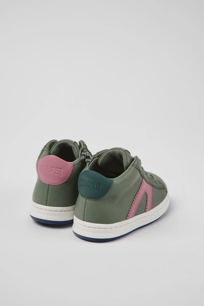 Green leather kids’ sneakers with OrthoLite® Recycledâ„¢ removable footbeds and rubber outsoles.