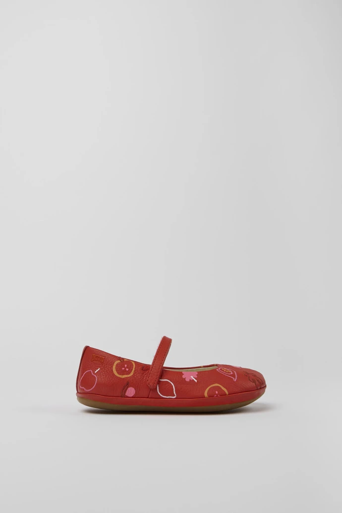 Red leather girls’ ballerinas with print and embroidery details, hook-and-loop closing system, and 100% rubber outsoles.