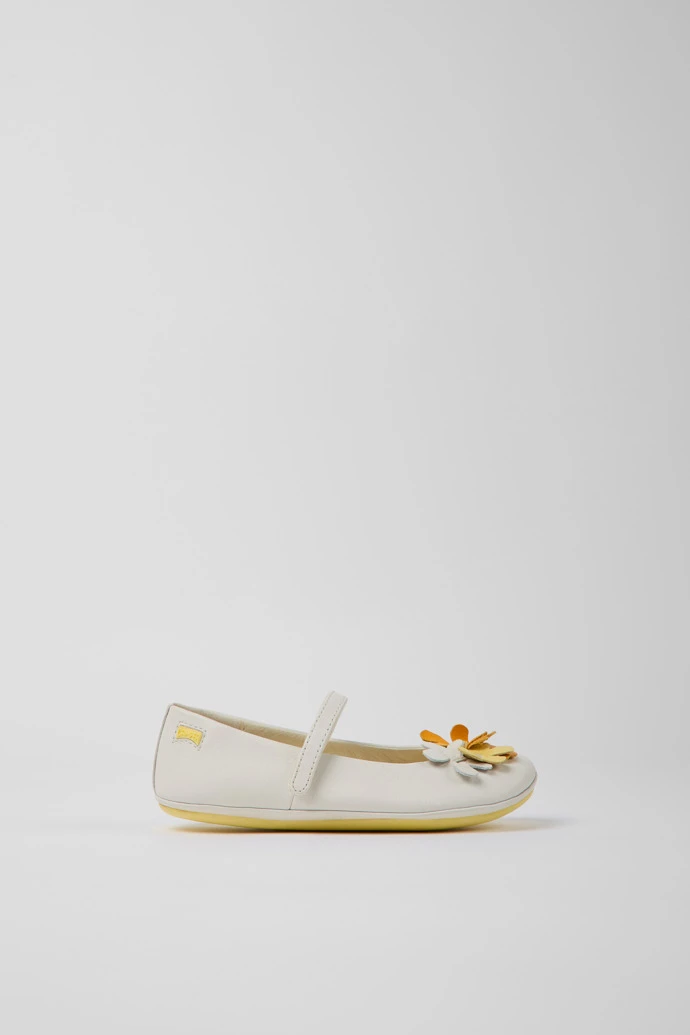 White leather kids’ ballerinas with flower detail, removable EVA footbeds, and rubber outsoles (20% recycled).
