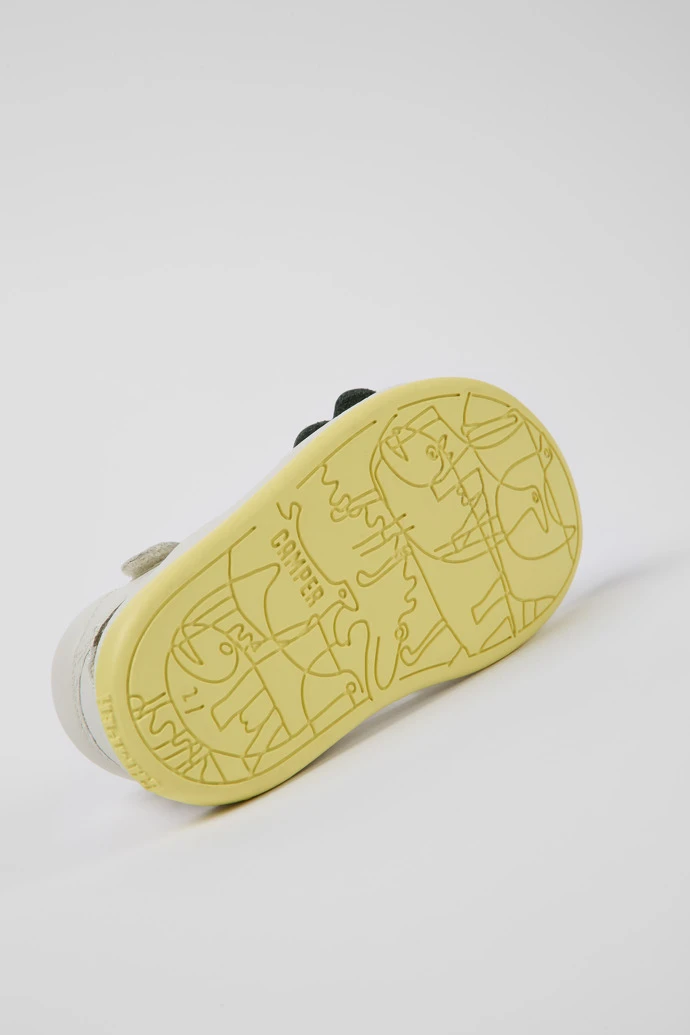 White leather kids’ sandals with flower detail, a hook-and-loop closing system, and rubber outsoles (20% recycled).