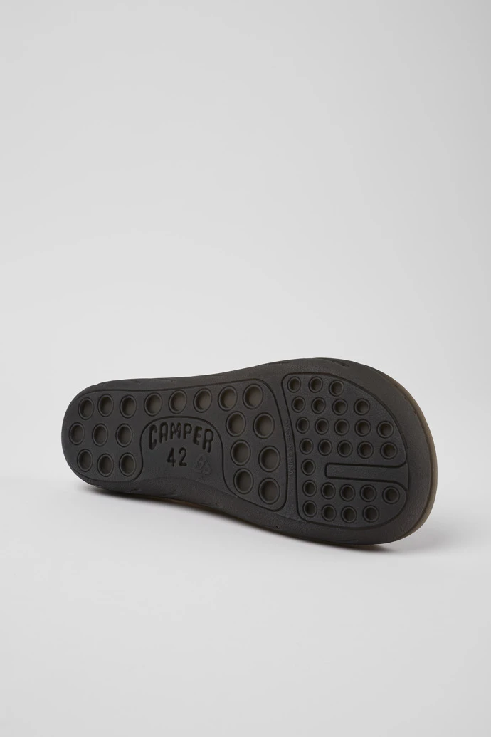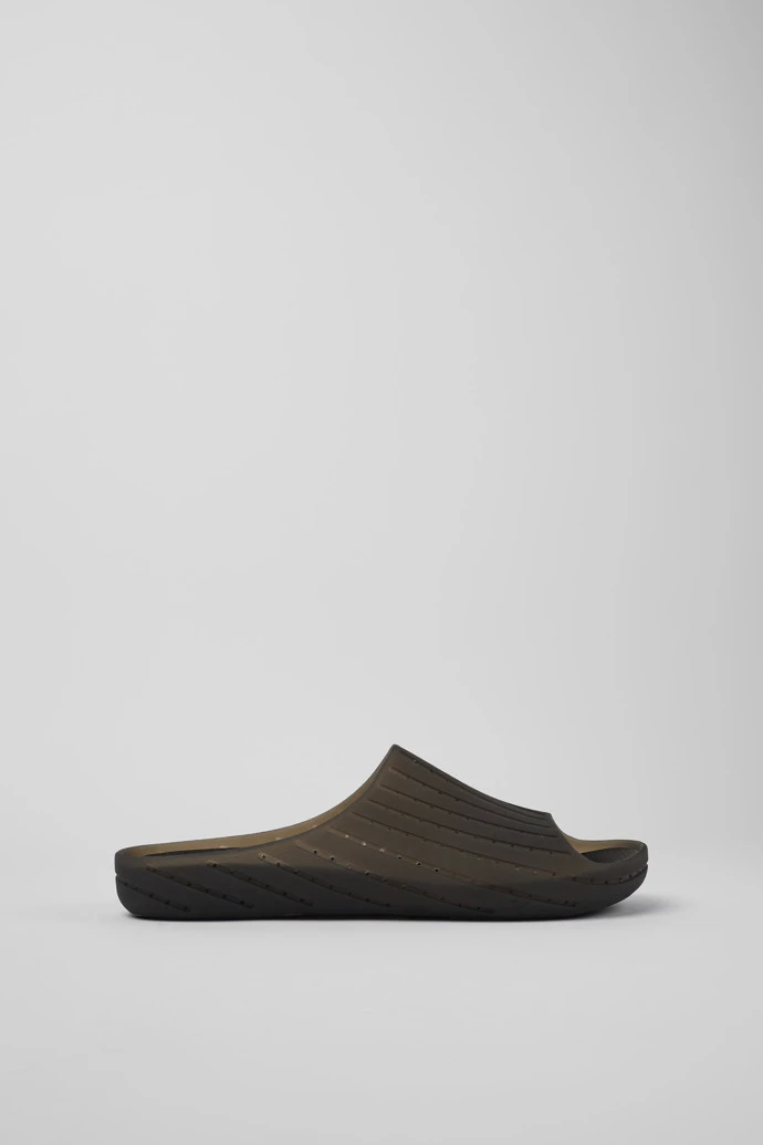 Black monomaterial slip-on men’s sandals with 100% TPU outsoles (20% recycled) and removable PU footbed. Fully recyclable.