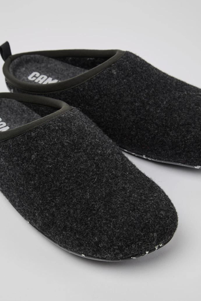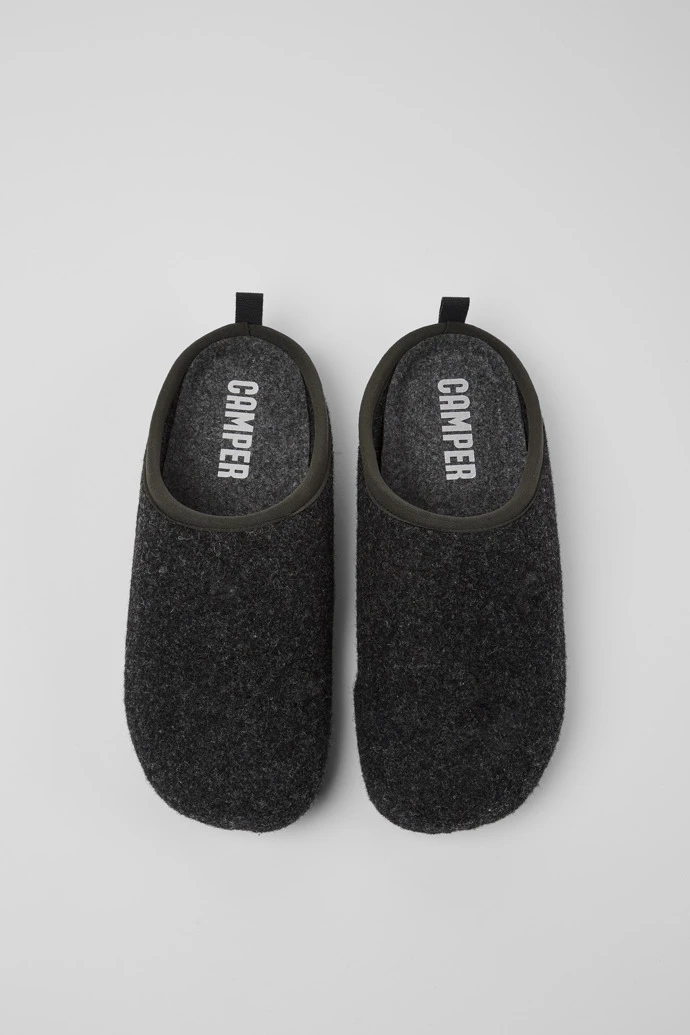 Dark gray wool men’s slipper. With removable EVA insole and rubber outsole.
