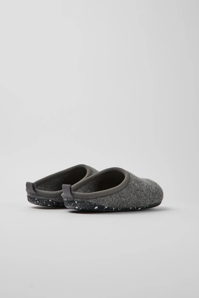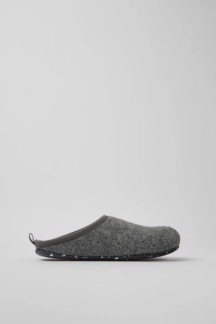 Dark gray wool women’s slipper. Rubber outsole and removable EVA insole.