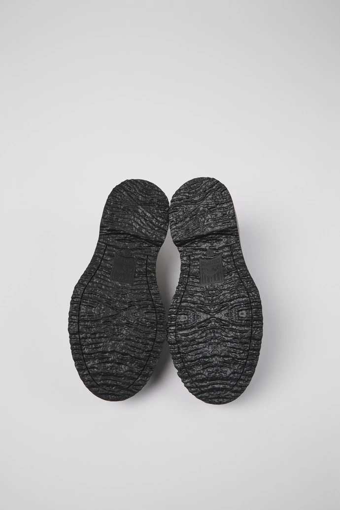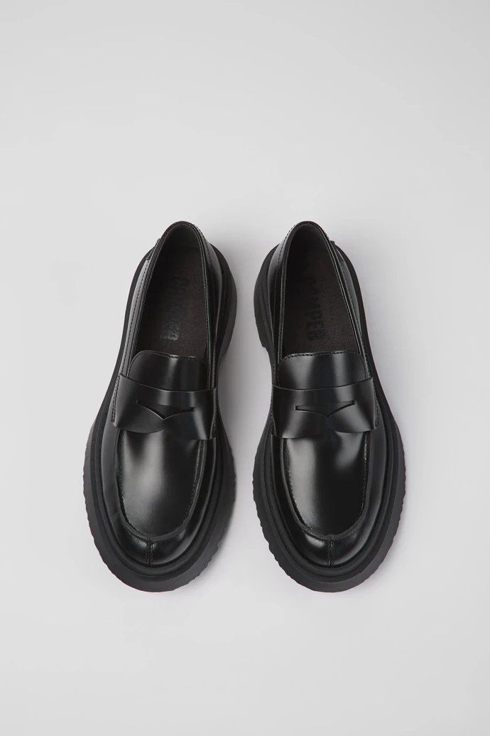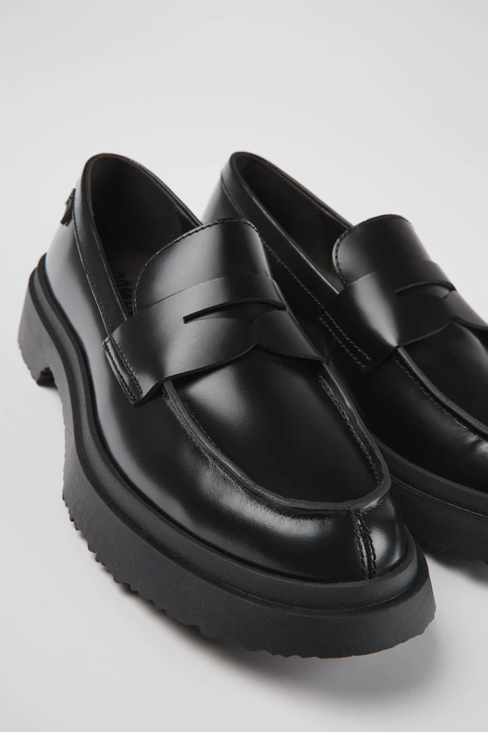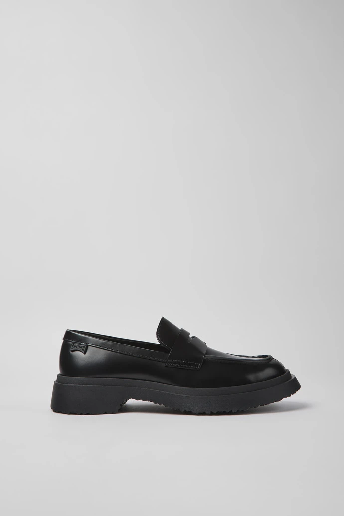 Black leather women’s loafers with OrthoLite® Recycled™ removable footbeds and rubber outsoles.