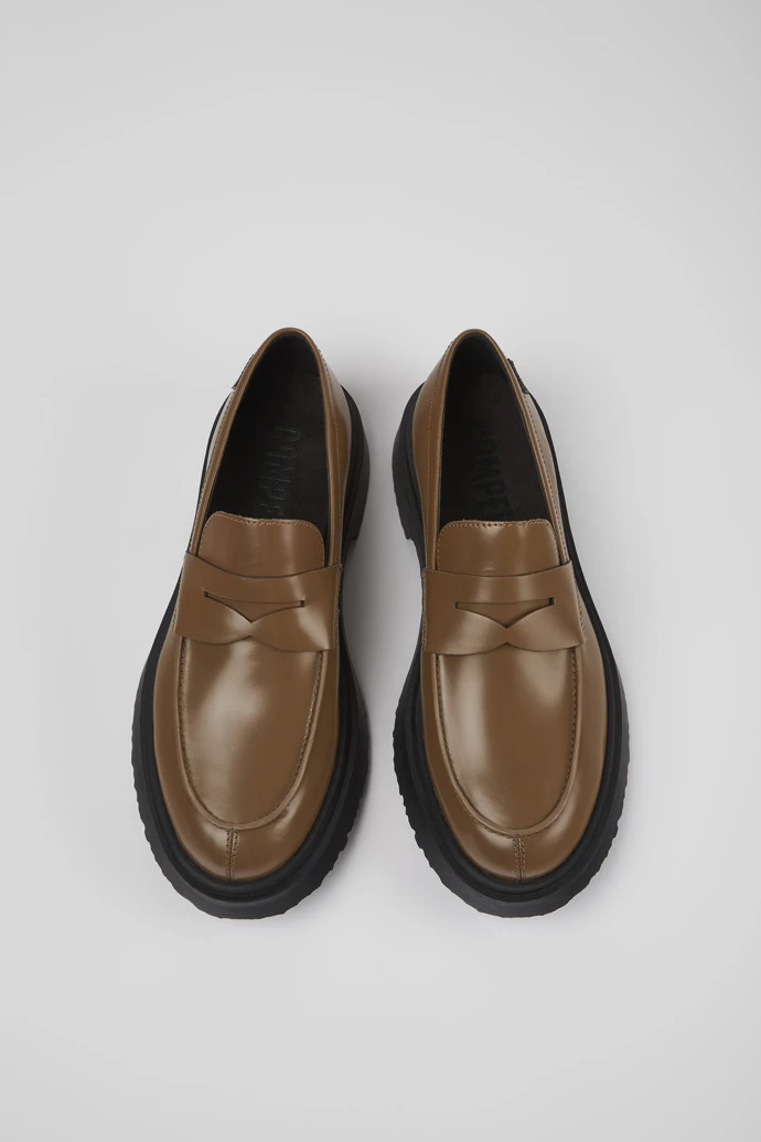 Brown leather men’s loafers with OrthoLite® Recycled™ removable footbeds and rubber outsoles.