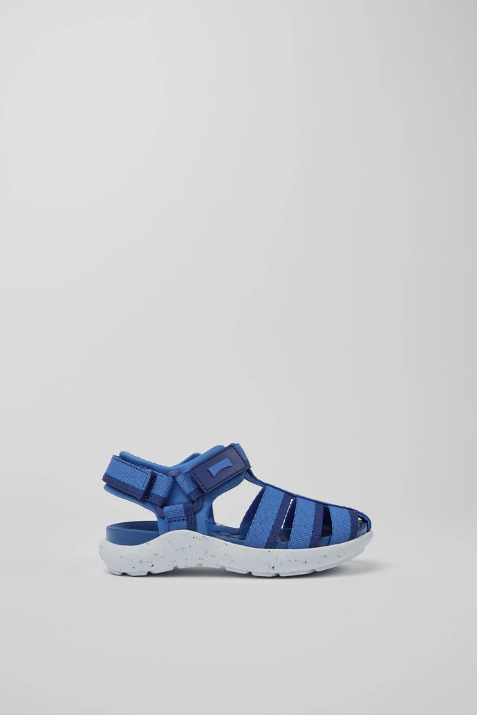 Blue coffee yarn kids’ sandals with recycled PET webbing, hook-and-loop closing system, and 100% rubber outsoles (20% recycled).
