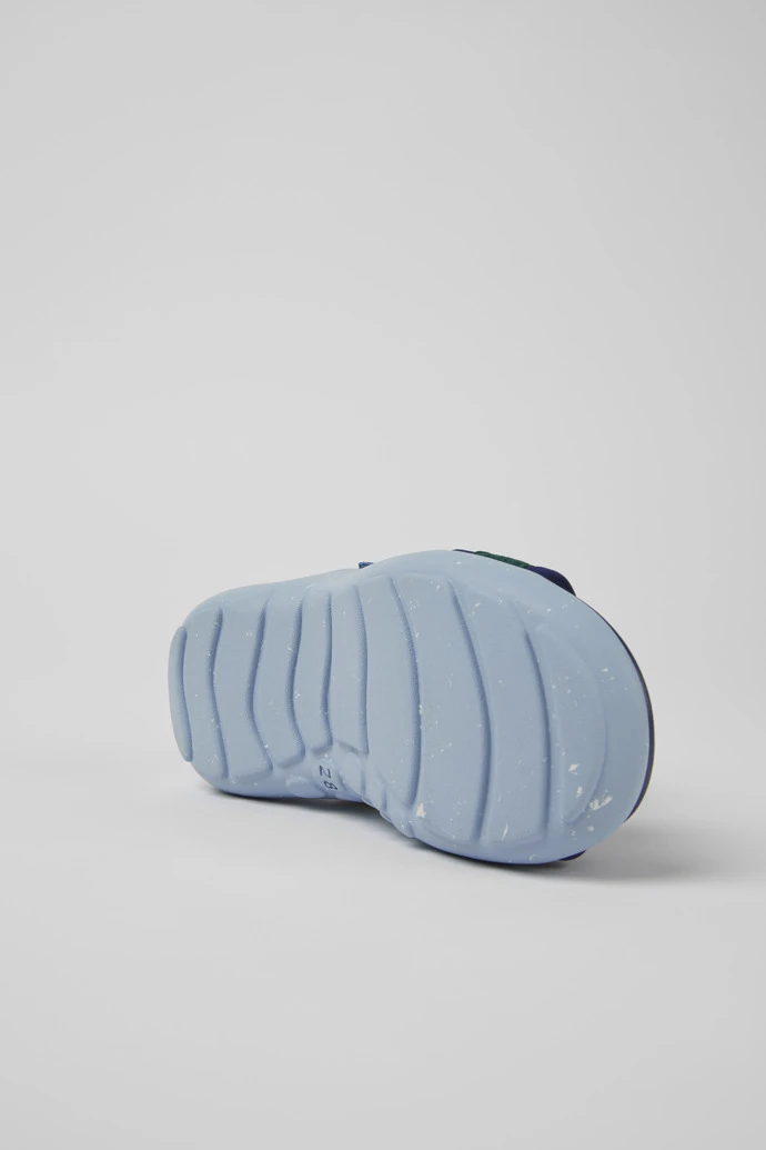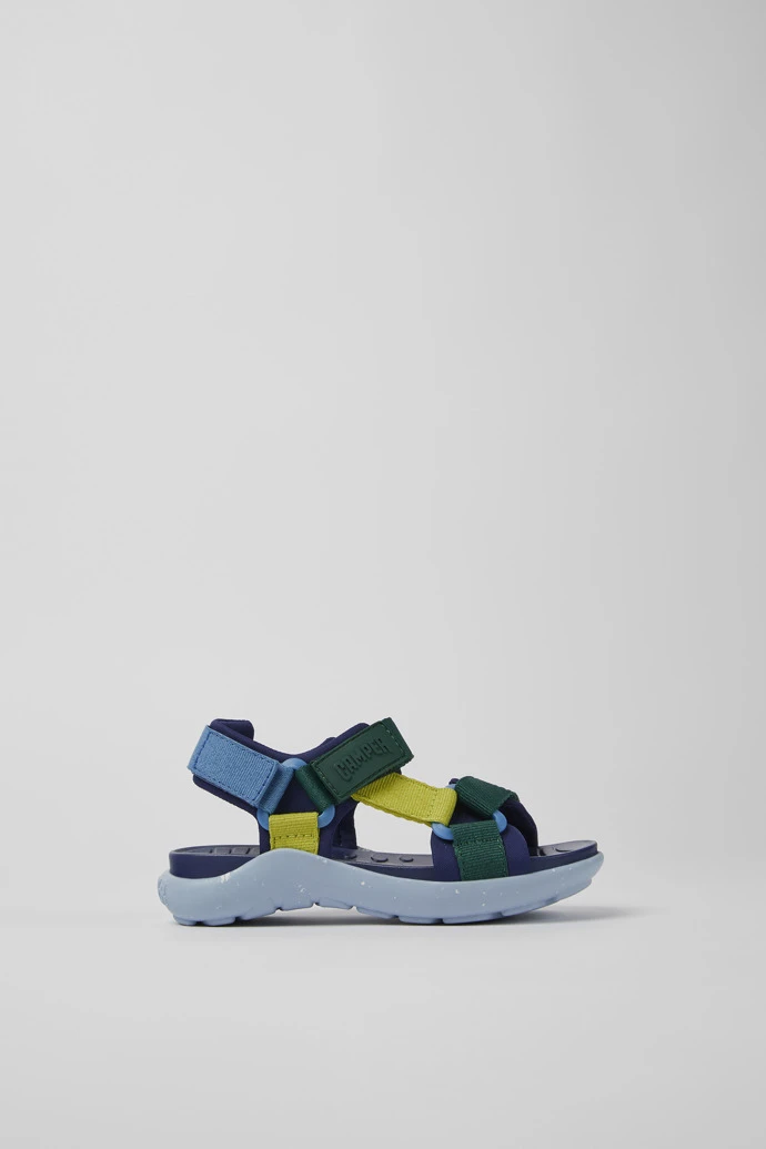 Multicolored textile kids’ sandals with OrthoLite® Recycled™ removable footbeds and rubber outsoles (20% recycled).