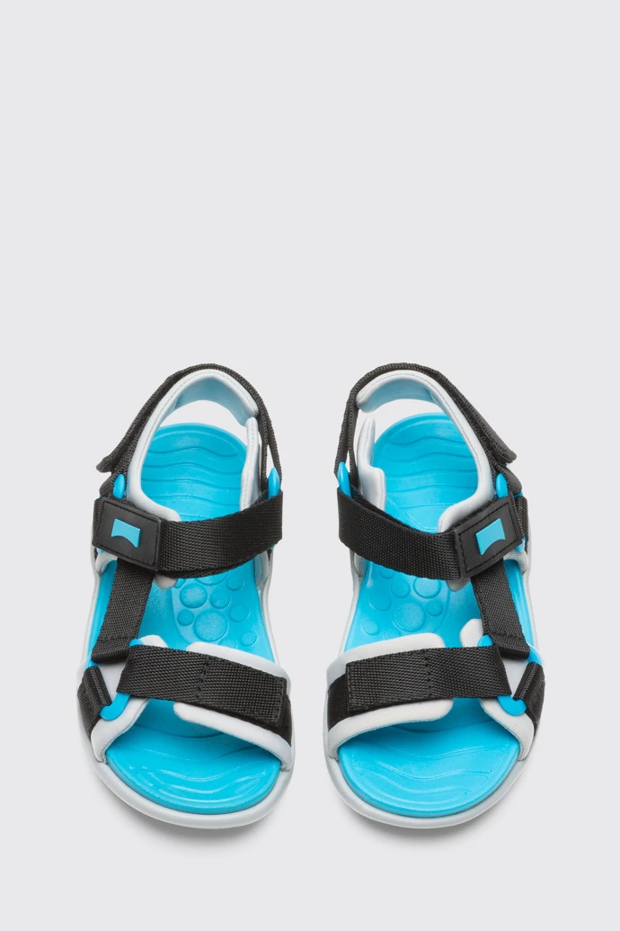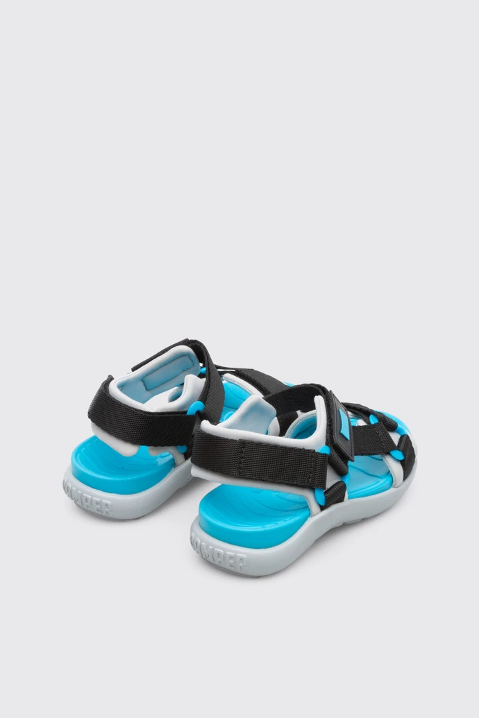 Kids’ multi-colored sandal with rubber outsole and Velcro straps. Black and blue details.